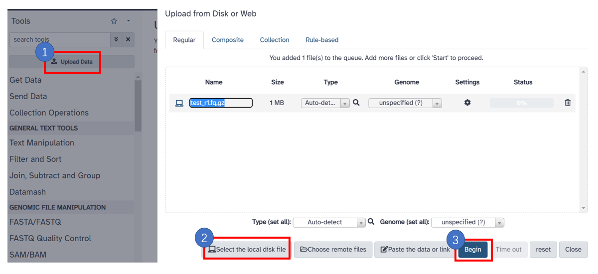 1. Click the [Upload Data] button. 2. Click [Select the local disk] and select your local sequencing file. 3. Click [Begin] button to start uploading data.