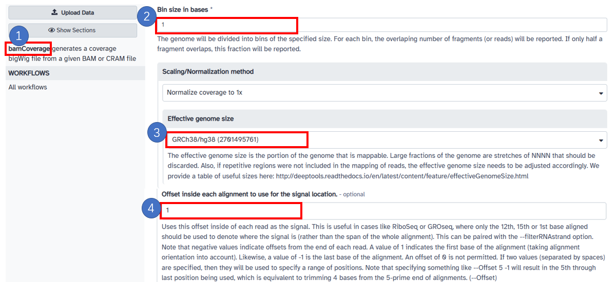 1. Select [bamCoverage] in the left panel. 2. Input [Bin size in bases] with [1]. 3. Select [Scaling/Normalization method] with [Normalize coverage to 1x]. 4. Input [Offset inside each alignment to use for the signal location] with [1]. This step can be paired with the [Only include reads originating from fragments from the forward or reverse strand.] option to get forward and reverse bw in 1bp.