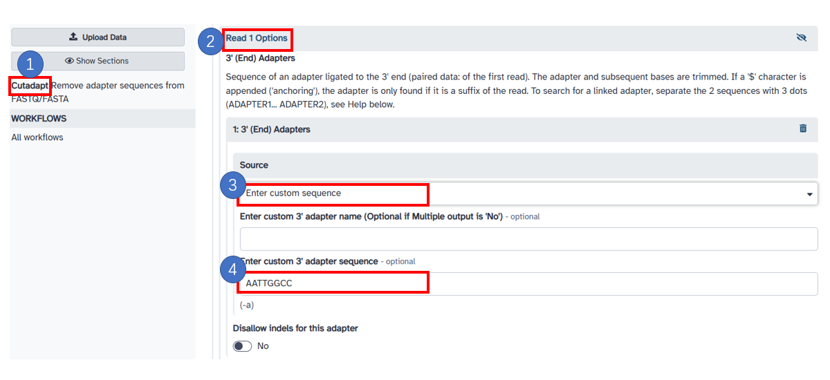 1. Click the [Cutadapt] option on the left panel. 2. Select [Read 1 Options]. 3. Select the [Enter custom sequence] option and enter your adaptor sequence like [AATTGGCC]. 4. You can also enter [A {100}] to remove the Polya sequence. -