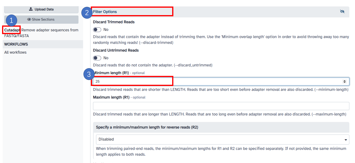 1. Select 'adapter options' under [Cutadapt]. 2. Click [Filter Options] button, the trimming option 'maximum error rate' and 'minimum overlap length' use the default values. 3. Fill in the [Minimum Length(R1)] as [25].