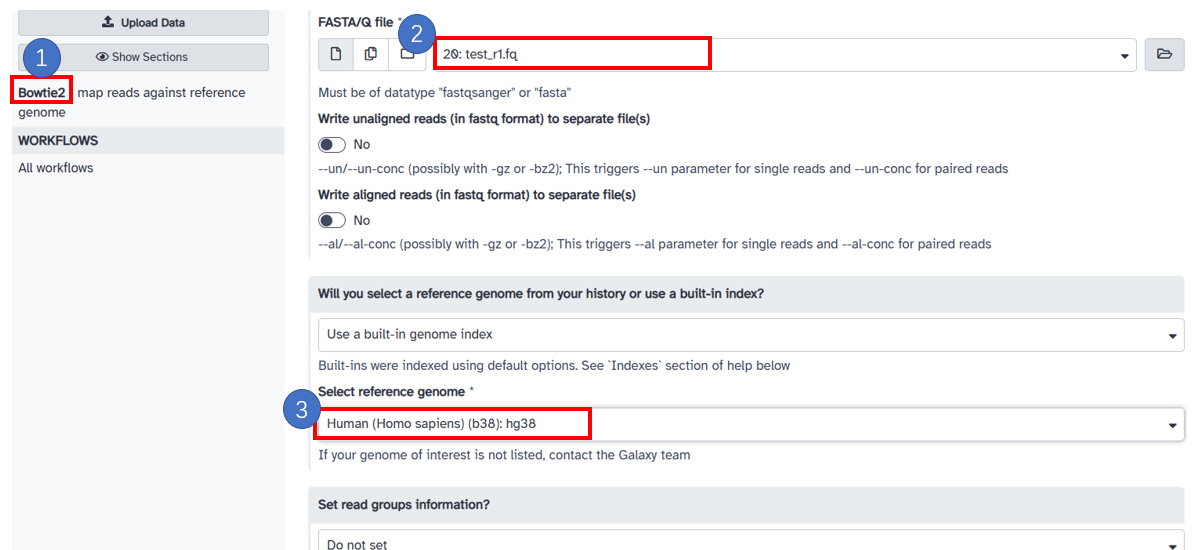 1. Select [Bowtie2] in the left sidebar. 2. Select the [FASTA/Q file] after removing the adaptors in the previous steps. 3. Select the built-in [reference genome] in server, here we select [Human(Homo sapiens)(b38): hg38].