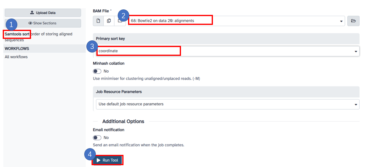 1. Select [Samtools sort] in the left panel. 2. Select the [BAM File] generated in the previous step. 3. Select the [Primary sort key] as [cooradinate]. 4. Click [Run Tool] button.