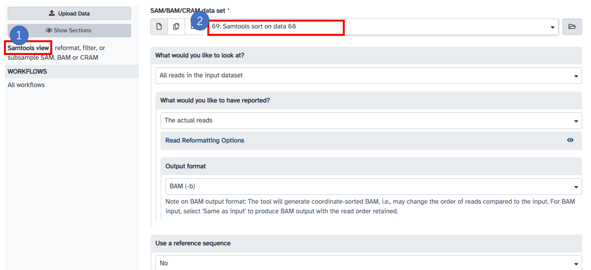 1. Select [Samtools view] in the left panel. 2. Select the [SAM/BAM/CRAM data set] generated in the previous step.