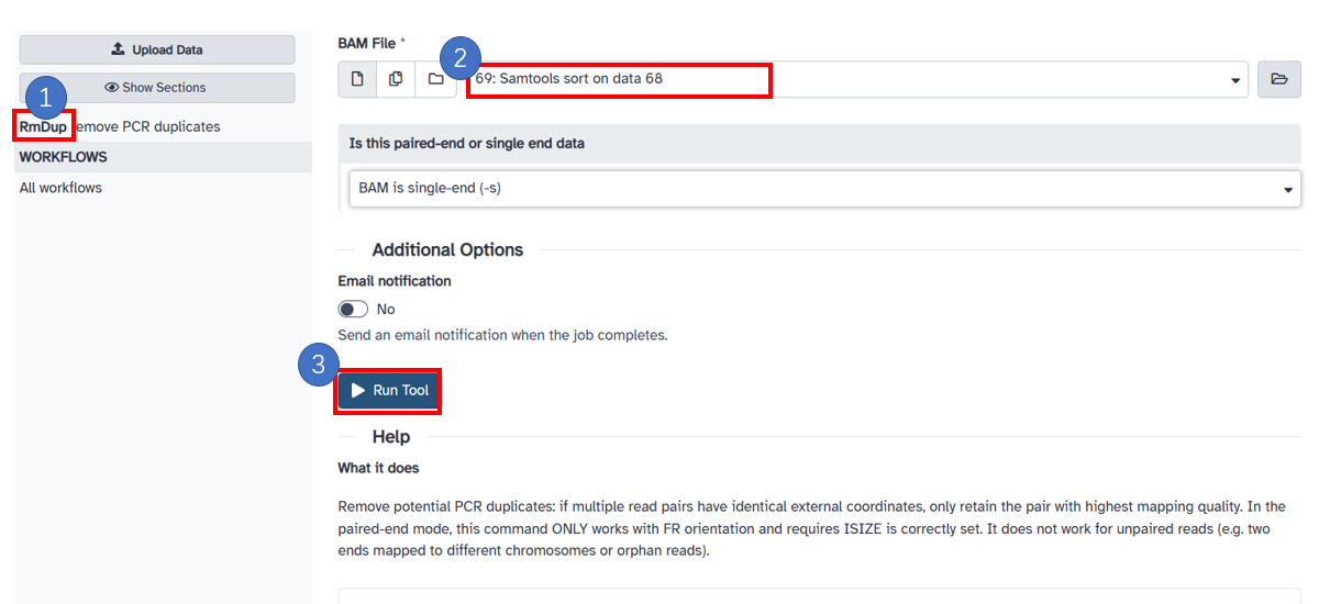 1. Select [RmDup] in the left panel. 2. Select the [BAM File] generated in the previous step. 3. Click the[Run Tool] button.