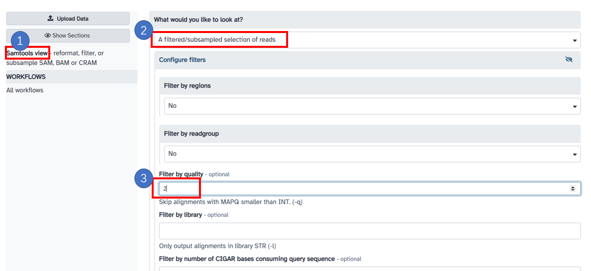 1. Select [Samtools view] in the left panel. 2. Choose [A filtered/subsampled selection of reads] 3. Fill in 2 in [Filter by quality]