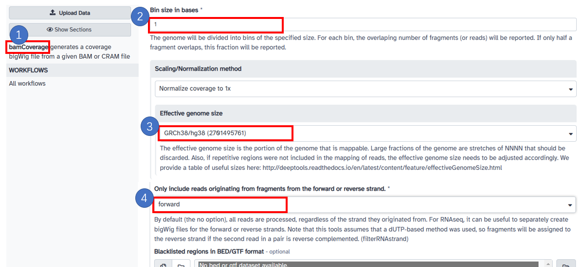 1. Select [bamCoverage] in the left panel. Select bam data in your galaxy history or upload your local file. 2. Input [Bin size in bases] with 1. Select [Scaling/Normalization method] with [Normalize coverage to 1x]. 3. Choose [Effective genome size] based on the reference. 4. In [Only include reads originating from fragments from the forward or reverse strand.] frame, choose forward.