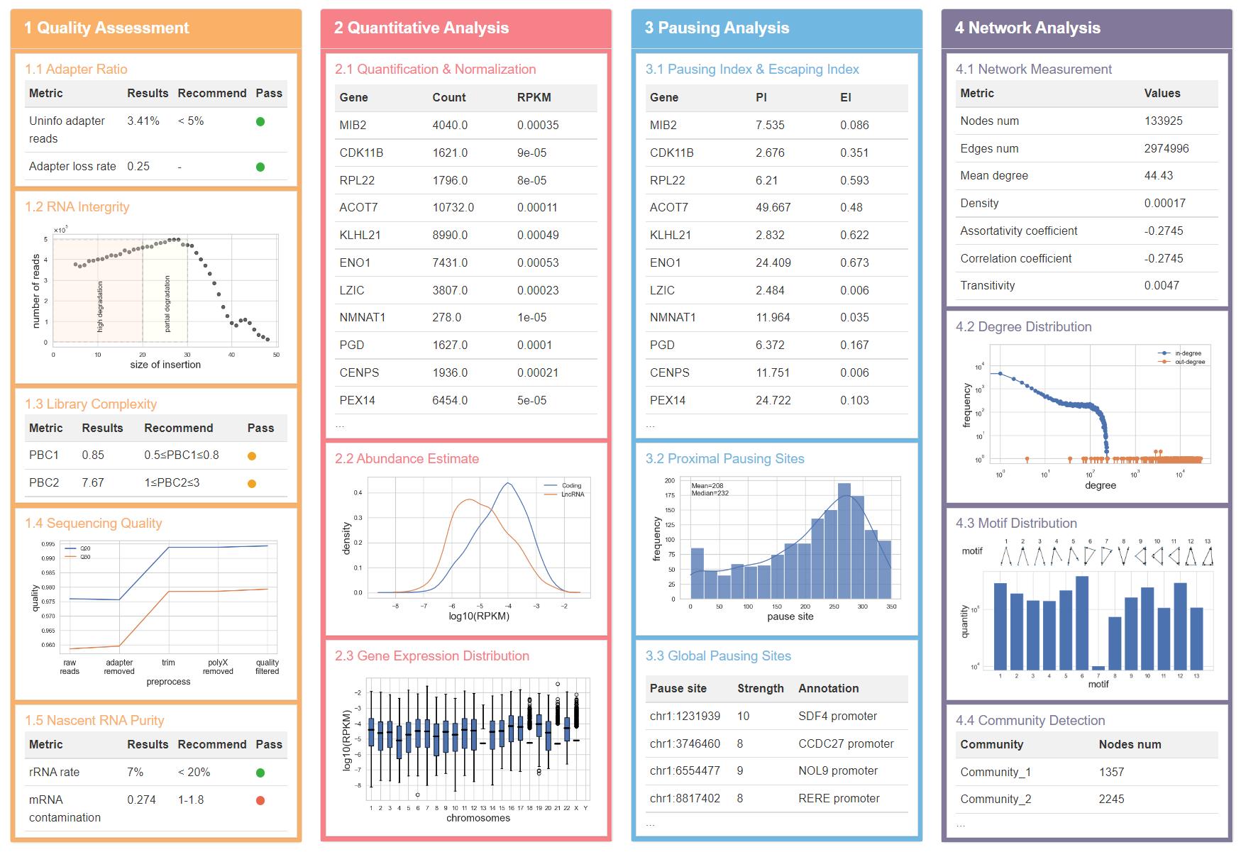 1. Systematic Quality Assessment. For any dataset pre-processed by nASAP or submitted by users, nASAP will return a web-based report to summarize the sequencing statistics, mapping ratio, RNA integrity, mRNA contamination, and run-on efficiency.
